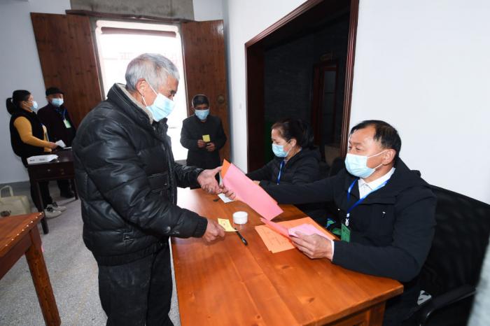 村民在浙江省杭州市临安区湍口镇迎丰村的基层投票点领取选票参加基层人大换届选举投票(2021年12月14日摄)。新华社记者徐昱摄