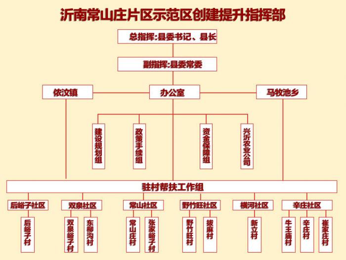 2020年,常山庄成立示范区创建指挥部,县委书记、县长任总指挥,明确3名县委常委牵头主抓,设立建设规划、政策手续、资金保障3个工作组实体运作,同时选派22名县直优秀干部驻村担任“第一书记”工作,并组建乡村振兴专家服务团靠上服务保障,形成了县委领导、指挥部统筹、乡镇主体、村级落实的组织管理体系。