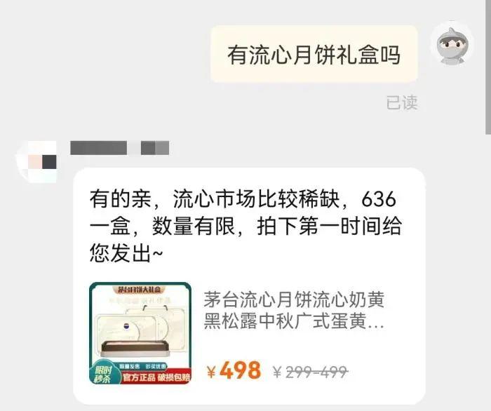 此前,中新财经曾咨询另一位售卖茅台月饼的商家客服,虽然页面显示已下架,但客服称,“仍然有货,价格为600元。”这位商家客服还表示,茅台大酒店的货7月下旬就已订完,现在货都在经销商手里。