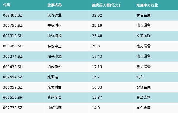 上周两市共有2419只个股有融资资金买入,共有17只个股买入金额超10亿元,其中天齐锂业、宁德时代、中远海控排名前三,买入金额分别32.32亿元、29.19亿元、23.48亿元。融资买入额前10个股详情见下表: