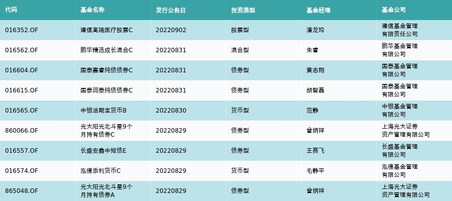 上周有9只新基金发行,分别为:建信高端医疗股票C、鹏华精选成长混合C、国泰嘉睿纯债债券C、国泰润泰纯债债券C、中银活期宝货币B、光大阳光北斗星9个月持有债券C、长盛安鑫中短债E、泓德添利货币C、光大阳光北斗星9个月持有债券A,详情见下表: