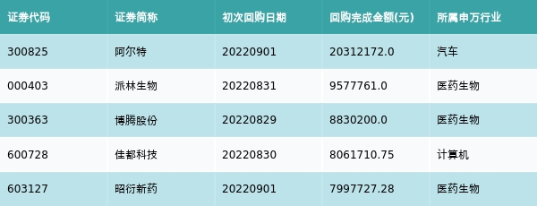上周共有13只个股开始执行回购公告,其中执行金额最多的五家公司为阿尔特、派林生物、博腾股份、佳都科技、昭衍新药。