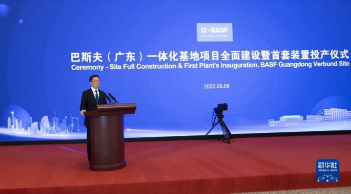 新华社北京9月6日电 9月6日,德国巴斯夫集团在广东湛江投资的巴斯夫(广东)一体化基地项目举行全面建设暨首套装置投产仪式。中共中央政治局常委、国务院副总理韩正出席并宣布项目全面建设启动暨首套装置投产。