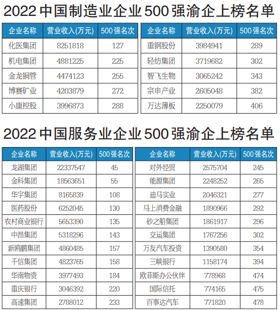 跻身2022中国制造业企业500强的10家渝企分别是:化医集团、机电集团、金龙铜管、博赛矿业、小康控股、重钢股份、轻纺集团、智飞生物、宗申产业、万达薄板;上榜2022中国服务业企业500强榜单的22家渝企包括龙湖集团、金科集团、华宇集团、医药股份、农村商业银行、中昂集团、新鸥鹏集团、千信集团、华南物资、重庆银行、高速公路、对外经贸、能源集团、迪马实业、马上消费金融、砂之船集团、交运集团、万友汽车投资、三峡银行、欧菲斯办公伙伴、国际信托、百事达汽车。