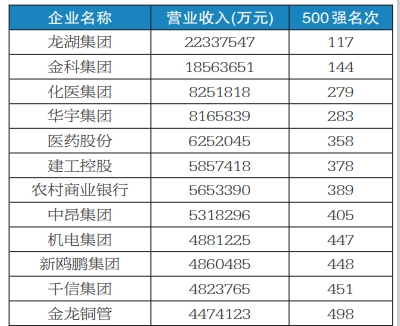 入选2022中国企业500强榜单的12家渝企分别是:龙湖集团、金科集团、化医集团、华宇集团、医药股份、建工控股、农村商业银行、中昂集团、机电集团、新鸥鹏集团、千信集团、金龙铜管,共7家国企、5家民企,主要涉及制造业、房地产业、建筑业、商贸业、金融服务业这5类行业领域,其中新鸥鹏集团、金龙铜管集团是首次入选。
