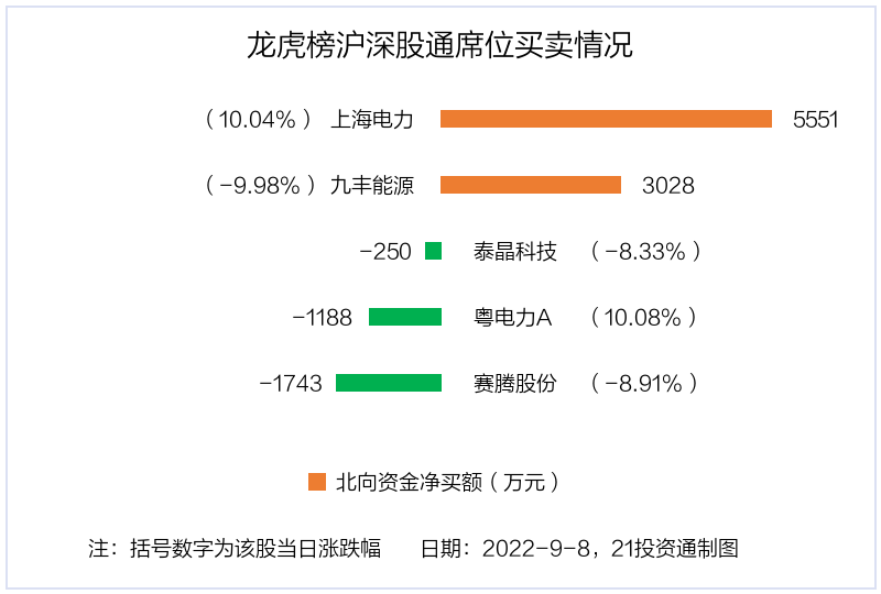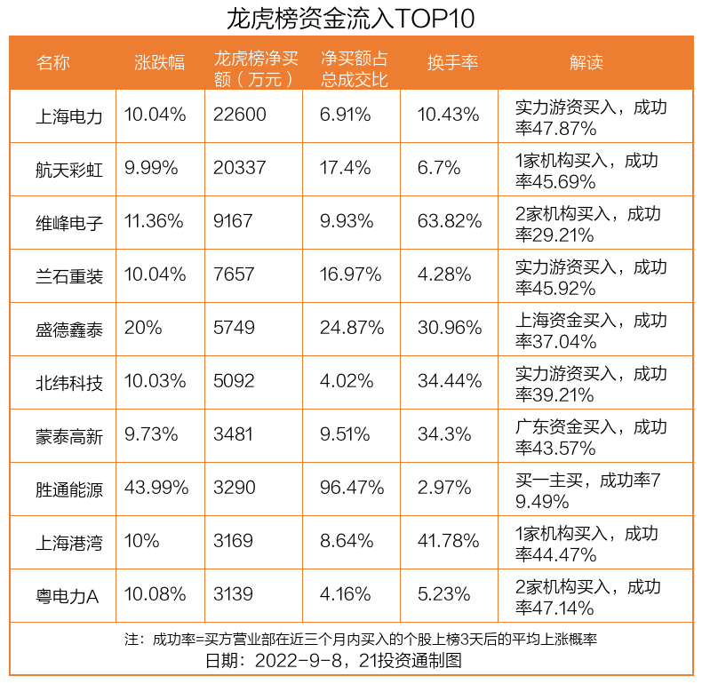 9月8日,上证指数下跌0.33%,深证成指下跌0.86%,创业板指下跌1.86%。盘后龙虎榜数据显示,共有44只个股因当日异动登上龙虎榜,资金净流入最多的是上海电力(600021.SH),达2.26亿元。