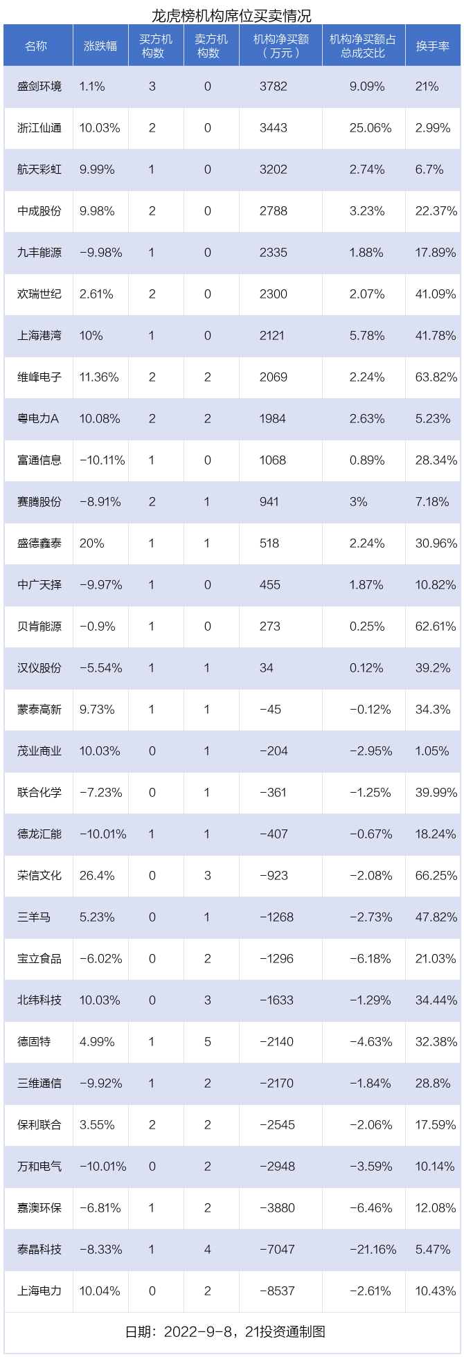 其中,机构净买入金额最多的是盛剑环境(603324.SH),当日收盘上涨1.1%,换手率为21%。前五大买卖营业部中有3家机构,为合计净买入3782万元,占总成交金额的9.09%。