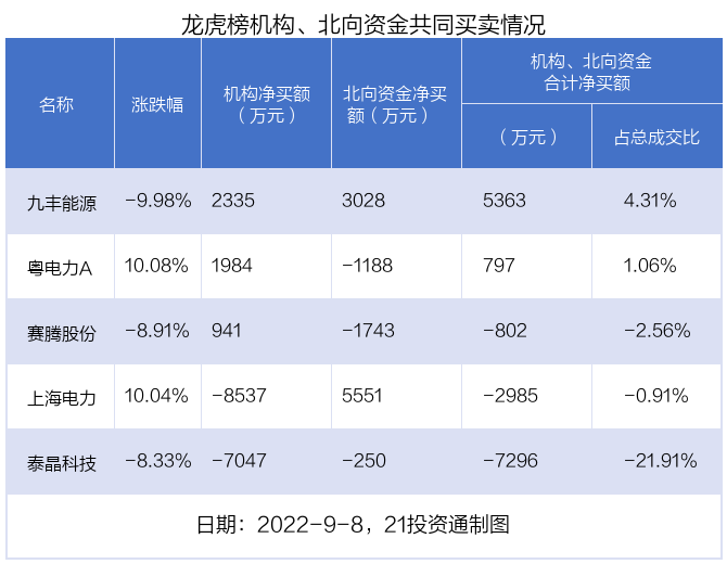 值得注意的是,机构和北向资金共同净买入了九丰能源;共同净卖出了泰晶科技;在上海电力,粤电力A,赛腾股份上出现分歧,机构净卖出上海电力8536.51万元,北向资金净买入5551.38万元;机构净买入粤电力A1984.45万元,北向资金净卖出1187.72万元;机构净买入赛腾股份940.9万元,北向资金净卖出1743.11万元。