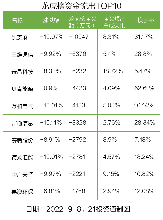 而龙虎榜中资金净流出最多的是黑芝麻(000716.SZ),被净卖出为1亿元,占总成交金额的8.31%。黑芝麻收盘下跌10.07%,换手率为31.17%。