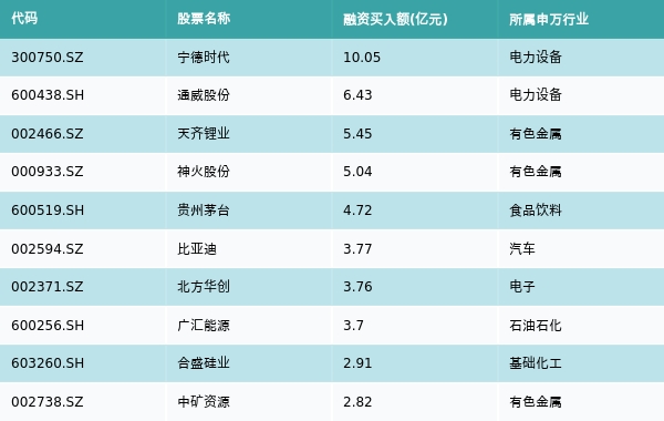 9月7日,两市共有2419只个股有融资资金买入,其中宁德时代、通威股份、天齐锂业排名前三,买入金额分别10.05亿元、6.43亿元、5.45亿元。融资买入额前10个股详情见下表: