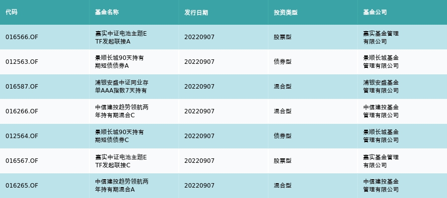 9月7日,有7只新基金发行,分别为:嘉实中证电池主题ETF发起联接A、景顺长城90天持有期短债债券A、浦银安盛中证同业存单AAA指数7天持有、中信建投趋势领航两年持有期混合C、景顺长城90天持有期短债债券C、嘉实中证电池主题ETF发起联接C、中信建投趋势领航两年持有期混合A,详情见下表: