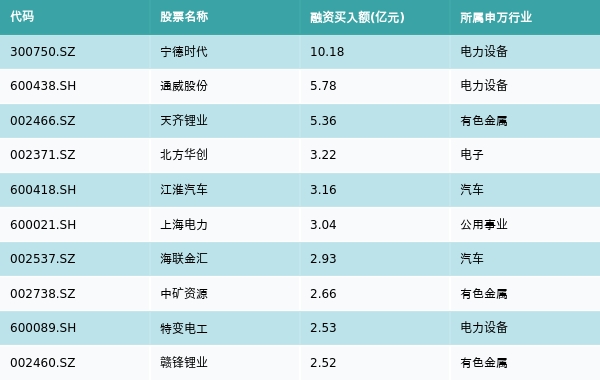 9月8日,两市共有2421只个股有融资资金买入,其中宁德时代、通威股份、天齐锂业排名前三,买入金额分别10.18亿元、5.78亿元、5.36亿元。融资买入额前10个股详情见下表: