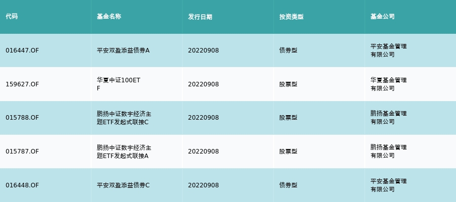 9月8日,有5只新基金发行,分别为:平安双盈添益债券A、华夏中证100ETF、鹏扬中证数字经济主题ETF发起式联接C、鹏扬中证数字经济主题ETF发起式联接A、平安双盈添益债券C,详情见下表: