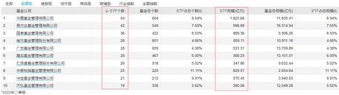 其中,华夏基金在管ETF数量高达54个,在全部基金公司中排名第一;