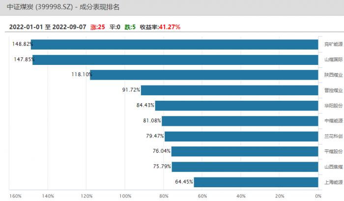 中证煤炭指数成分股年内表现排名,截至2022年9月7日,图片来源:Wind