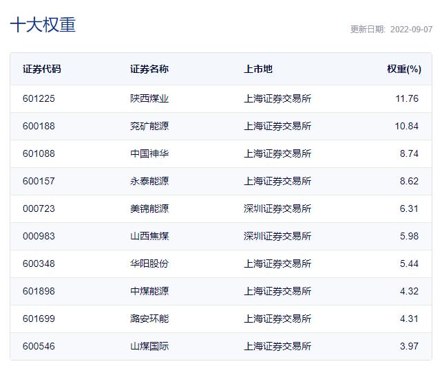 中证煤炭指数十大权重股,截至2022年9月7日,图片来源:中证指数公司
