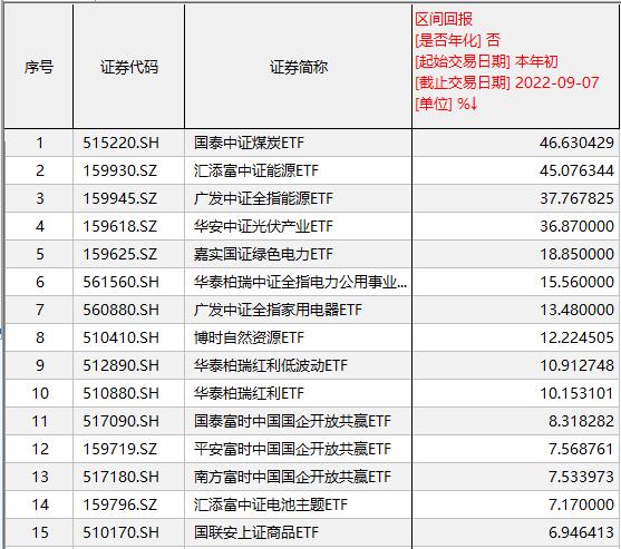据Wind数据,共有10只股票型ETF基金年内(截至2022年9月7日,下同)收益率超过10%,多为煤炭、光伏、电力等能源相关ETF。
