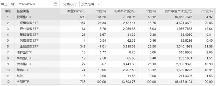 Wind数据显示,截至9月7日,股票型ETF共计598只,资产净值合计达10053.7675亿元,也是在ETF大家族中规模“No.1”(截至当前,ETF总市场规模约为1.51万亿)。
