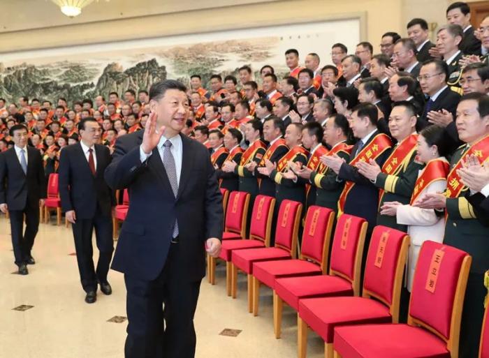 2020年10月20日,党和国家领导人习近平、李克强、王沪宁等在北京会见全国双拥模范城(县)命名暨双拥模范单位和个人表彰大会代表。新华社记者黄敬文摄