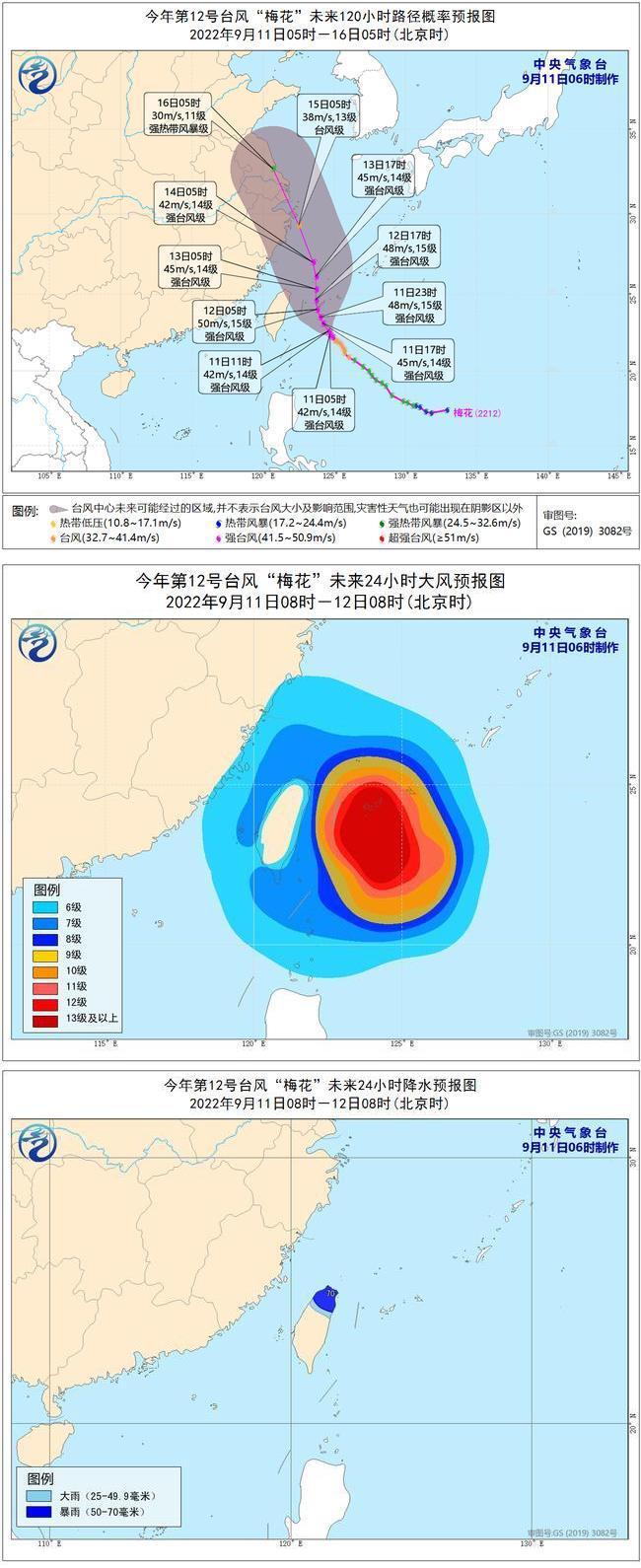 大风预报:9月11日8时至12日8时,东海南部海面、台湾海峡、台湾以东洋面、巴士海峡、我国台湾岛沿海、钓鱼岛附近海域有6—7级大风,阵风8—9级;东海东南部海域和台湾以东的部分海域有8—11级大风,“梅花”中心经过的附近海面和地区的风力有12—15级,阵风可达16级。