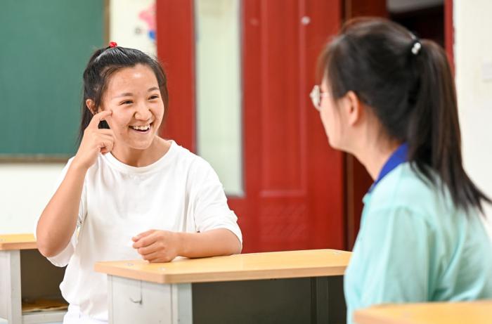 在内蒙古呼和浩特市特殊教育学校,王雅妮(左)和聋哑学生用手语谈心(2022年8月8日摄)。新华社记者 连振 摄