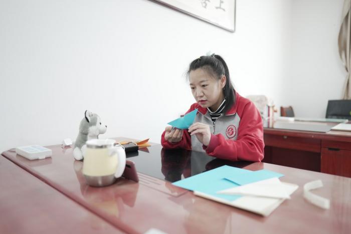 个头比学生高不了多少,站在学生当中,个子大些的能把她“淹没”。很多知识点需要反复操作示范,打手语就像是“体力活”,一通操作下来,细密的汗珠爬满额头。