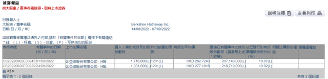 首次减持仅三天后,港交所又披露了新的减持动作。港交所文件显示,伯克希尔哈撒韦公司9月1日减持171.6万股比亚迪股份H股,均价262.72港元,价值4.5亿港元,剩余持股数2.0714亿股,持股比例下调至18.87%。