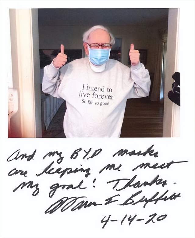 巴菲特本人也毫不吝啬对比亚迪的赞美。2020年4月,一张股神戴着比亚迪口罩的照片在网上流传。巴菲特称,我的目标是长命百岁,比亚迪口罩助我一臂之力。事实证明,坚定持有的回报颇丰。