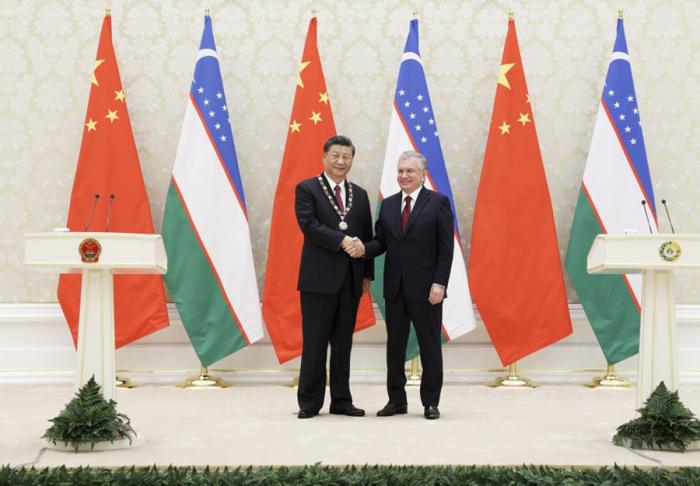 2022年9月15日,国家主席习近平在撒马尔罕国际会议中心接受乌兹别克斯坦总统米尔济约耶夫授予“最高友谊”勋章。