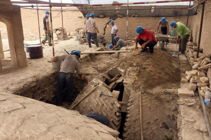 在乌兹别克斯坦希瓦古城阿米尔•图拉经学院,中乌文物修复人员在经学院东南角穹顶上方进行加固施工(2018年6月21日摄)。2021年,希瓦古城历史文化遗迹经过中乌联合修复顺利完成并移交乌方。