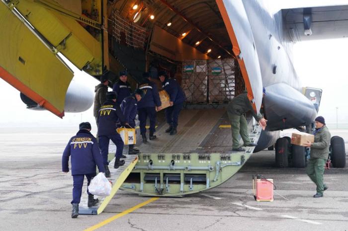 在乌兹别克斯坦塔什干国际机场,乌方工作人员将援助中国的抗疫物资搬上专机(2020年2月12日摄)。新冠肺炎疫情发生以来,中乌两国守望相助,风雨同行,积极开展抗疫合作。