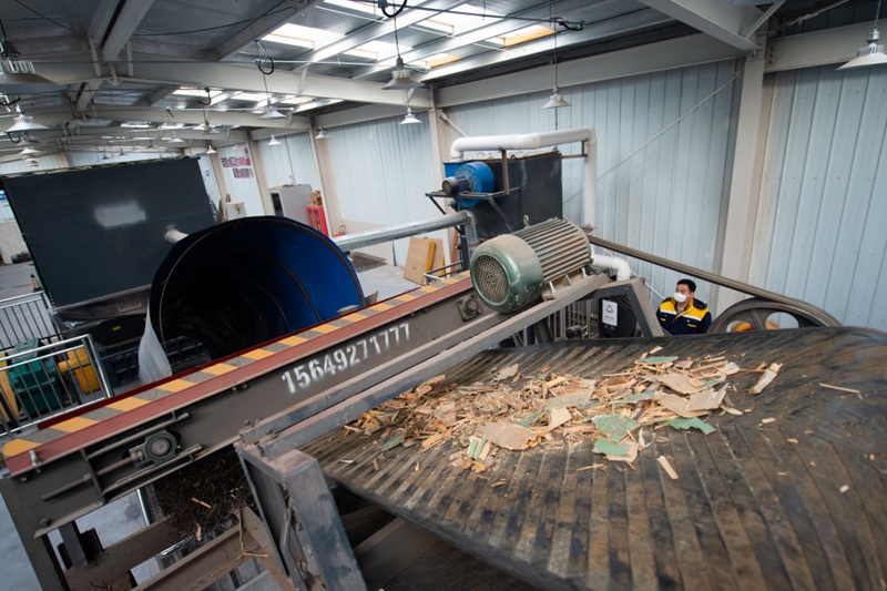 ↑位于北京市东城区的东直门城市生态岛是一个由大件废弃物处理区、厨余垃圾生物降解展厅和垃圾分类科普微展厅三部分组成的中小型垃圾中转站。这是在大件废弃物处理区,大件废弃物处理后分解为小体积碎屑(2020年11月20日摄)。