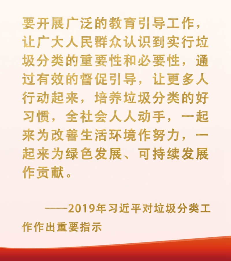 习近平总书记十分关心垃圾分类工作这件“关键小事”。他强调,实行垃圾分类,关系广大人民群众生活环境,关系节约使用资源,也是社会文明水平的一个重要体现。