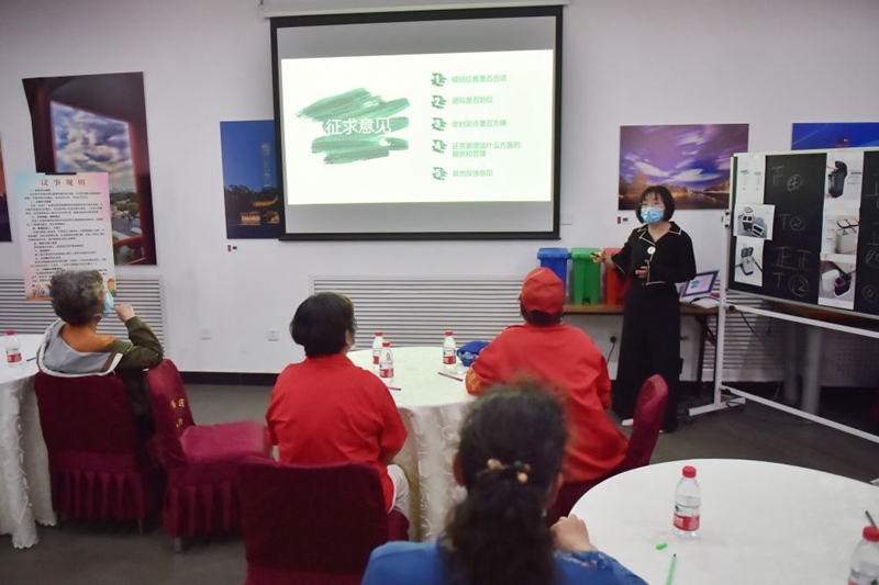 ↑在北京市建国门街道赵家楼社区议事厅举行的“两桶一袋”居民征求意见恳谈会上,来自社区的12位居民代表对“两桶”款式进行投票选择。同时,街道针对桶站位置、定时定点投放等垃圾分类运营管理听取居民意见(2020年5月2日摄)。