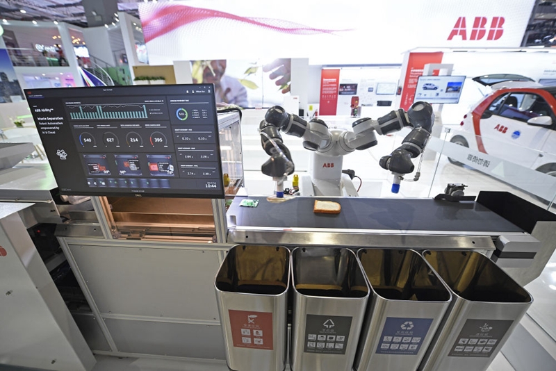 ↑在上海举行的第二届进博会上,一家瑞士公司展出的全自动垃圾分类设备(2019年11月5日摄)。