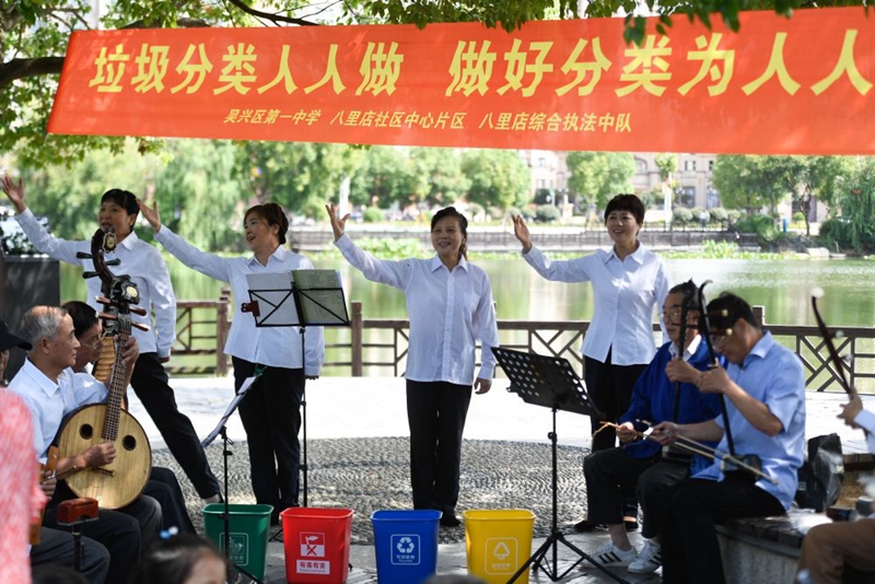 ↑浙江省湖州市吴兴区八里店镇沈根法草根文艺宣讲队向居民宣讲垃圾分类知识(2019年9月20日摄)。