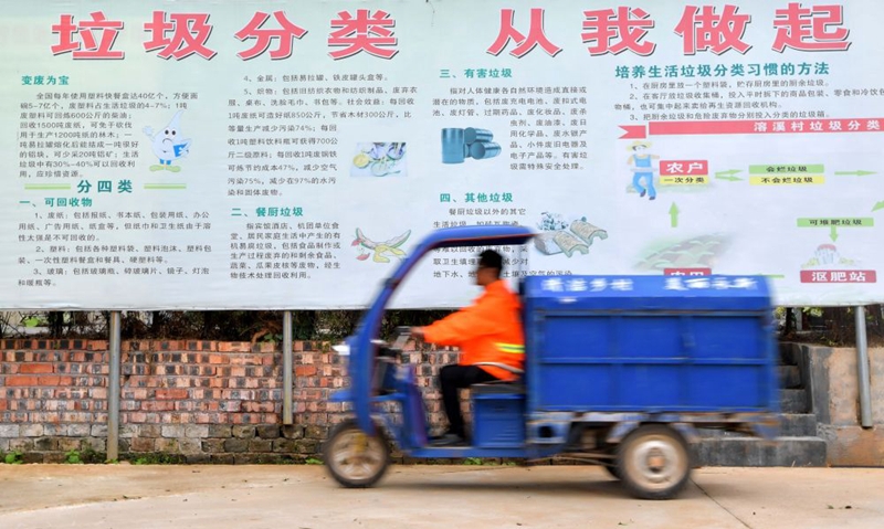 ↑在江西省永新县莲洲乡溶溪村,村里的保洁员从垃圾分类宣传栏前经过(2017年10月18日摄)。