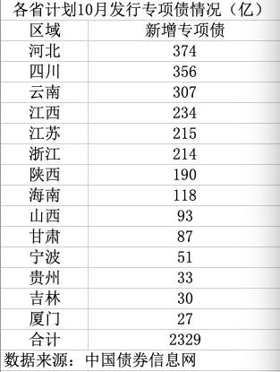 近期,相关进展进一步清晰。中国债券信息网信息显示,辽宁省将在9月27日(本周二)发行67亿元新增专项债,投向基础设施领域和棚改领域。另据记者梳理,截至9月25日,已有14个地方披露发债计划,计划10月发行新增专项债2329亿,其中河北省最多(374亿),其次为四川(356亿)、云南(307亿)。