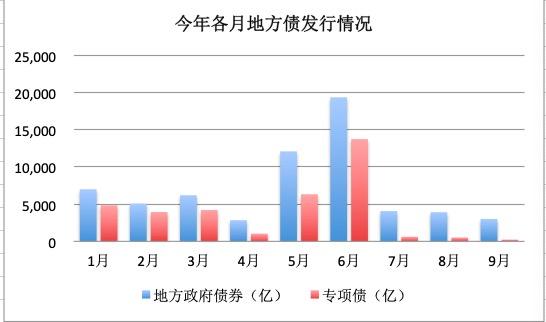 Wind数据显示,截至9月25日,今年地方债发行规模达到6.3万亿,其中新增专项债发行3.53万亿(800亿利用去年结转额度发行)。分月度看,今年1-4月发行规模在2000亿-7000亿左右,5月发行规模达到1.2亿,6月发行2万亿创下历史新高,7-9月发行规模回落至3000亿左右。