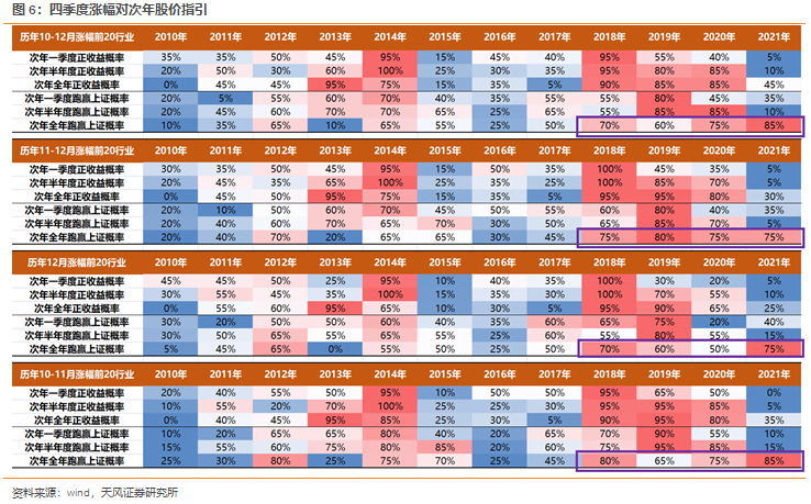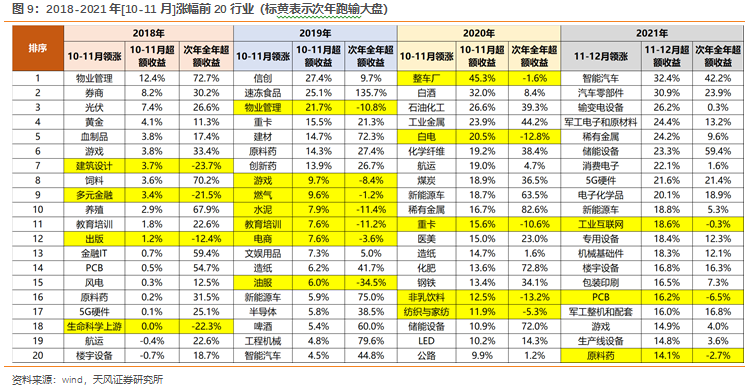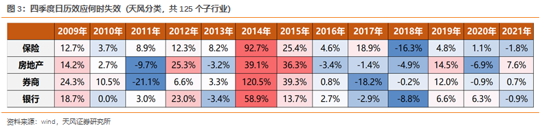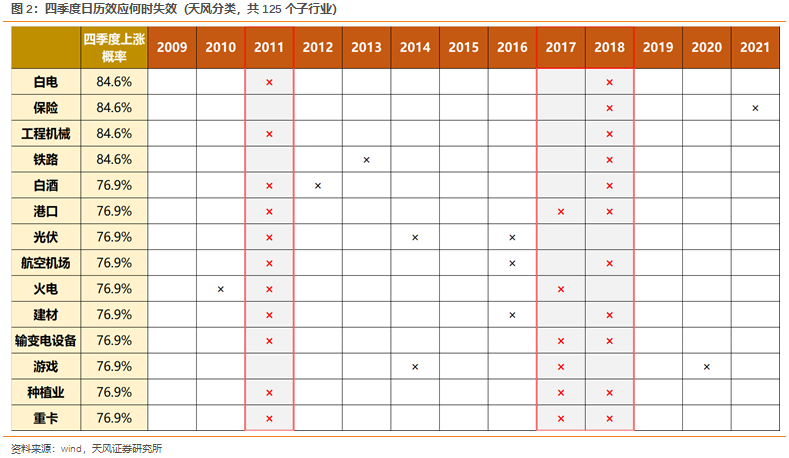 稳定低估值及部分早周期板块在四季度呈现出较为明显的日历效应。过往胜率最高的行业包括白电、保险、工程机械、铁路、白酒等。但四季度日历效应是建立在对来年经济预期平稳的基础上,在宏观预期悲观的2011年、2017-2018年,日历效应失效。