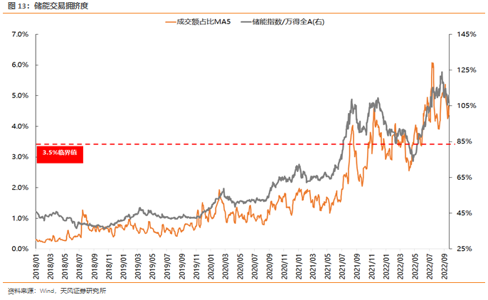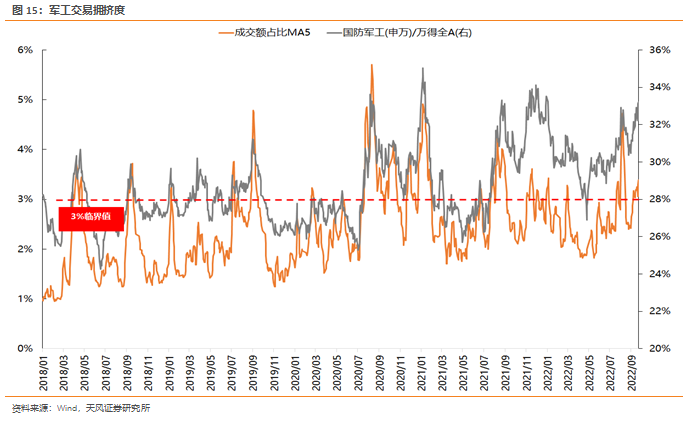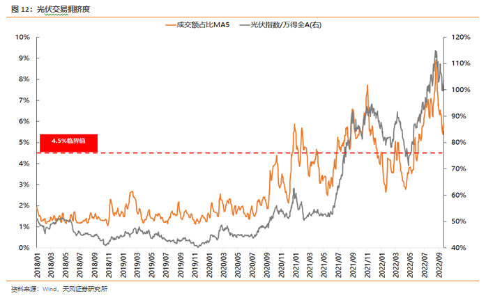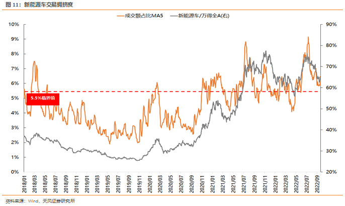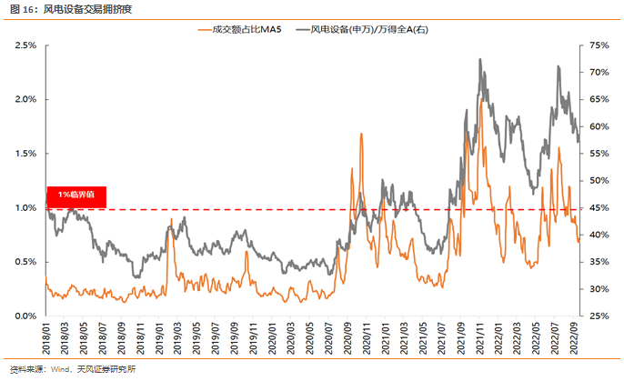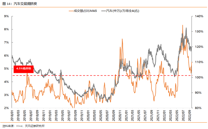 因此可以更倾向于提前布局来年高增长(高景气+困境反转)方向。7月初开始,汽车、光伏、新能源车等赛道的成交额占比(拥挤度)快速提升,对应这些板块的龙头开始下跌,对利好钝化、对利空敏感。经过过去一个阶段的调整,军工板块率先完成拥挤度消化,在9月率先展开反弹;风电设备交易拥挤度也已降至临界值下方;其他高景气板块如新能源车、光伏等交易拥挤度也已较前期明显下滑。