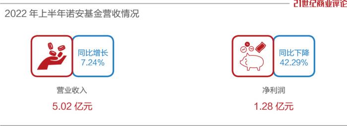 2022年上半年,诺安基金实现营业收入5.02亿元,净利润1.28亿元。虽然营收同比增长7.24%,但净利润却同比下降了42.29%。