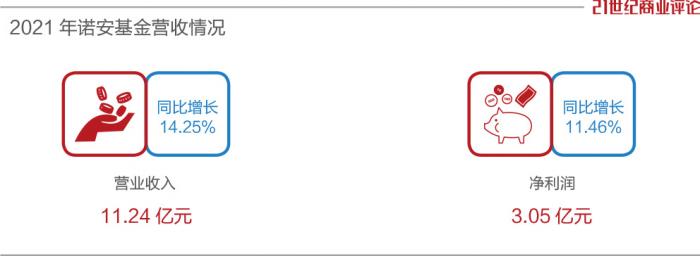 2021年诺安基金实现营业收入11.24亿元,同比增长14.25%,净利润3.05亿元,同比增长11.46%。
