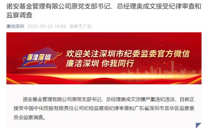 9月25日,廉洁深圳发布一则公告显示,诺安基金原党支部书记、总经理奥成文涉嫌严重违纪违法,目前正接受调查。