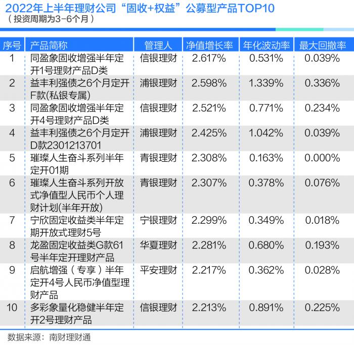 在理财公司“固收+权益”公募型产品(投资周期3-6个月)上半年业绩榜单中,信银理财的“同盈象固收增强”系列上榜2只产品,分别为“同盈象固收增强半年定开1号D类”和“同盈象固收增强半年定开4号D类”,分列榜单第一位和第三位,净值增长率分别为2.617%和2.521%。