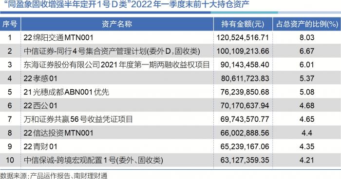 以榜首产品“同盈象固收增强半年定开1号D类”为例,该产品成立于2021年10月13日,建仓期为3个月,封闭运作期为6个月,在2022年4月27日开放申购,之后按半年为周期开放,业绩比较基准为4%,风险评级为二级(中低风险),起购金额较高,为100万元。根据2022年一季度报告,截至3月31日,产品最新资产净值为13.99亿元。