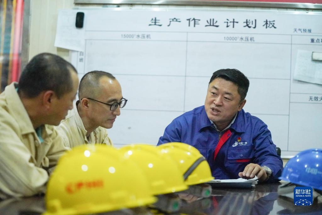 刘伯鸣(右一)在厂房会议室内与工友讨论生产作业事项(2022年9月17日摄)。新华社记者 王松 摄