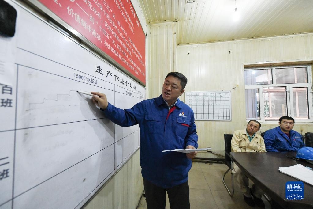 刘伯鸣在厂房会议室内为工友讲解生产任务(2022年9月17日摄)。新华社记者 王松 摄