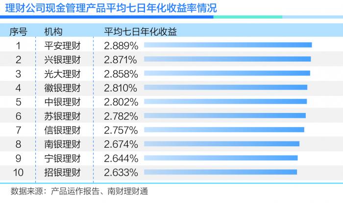 现金管理产品平均业绩排名前三的为平安理财、兴银理财和光大理财,上半年平均七日年化收益依次为2.889%、2.871%和2.858%。