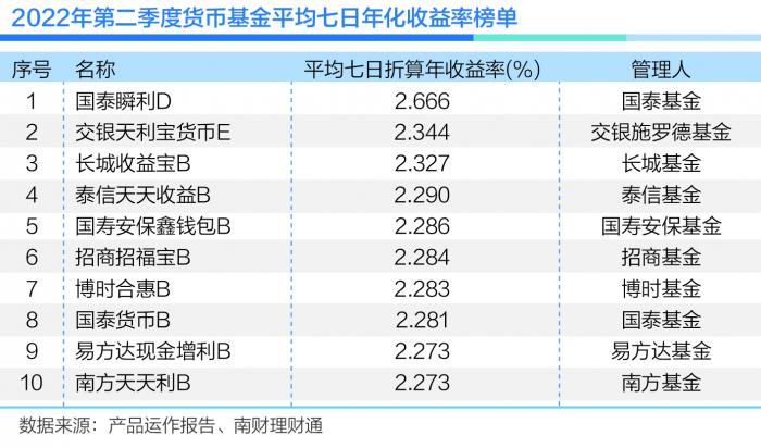 据南财理财通数据,截至2022年6月30日,在第二季度货币基金平均七日年化收益率榜单中,排名前三的产品分别为国泰基金“国泰瞬利D”、交银施罗德基金“交银天利宝货币E”和长城基金“长城收益宝B”,平均七日年化收益率依次为2.666%、2.344%和2.327%。值得注意的是,前十榜单中,国泰基金的产品占据两席。